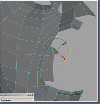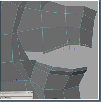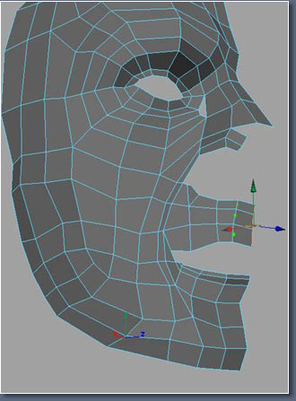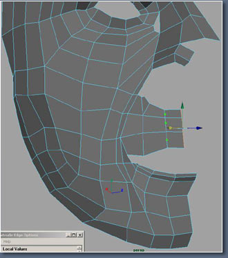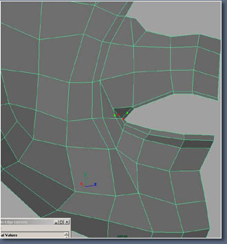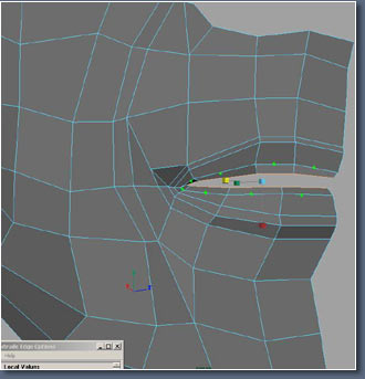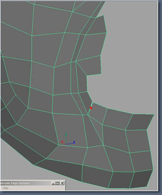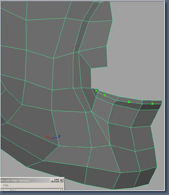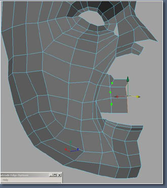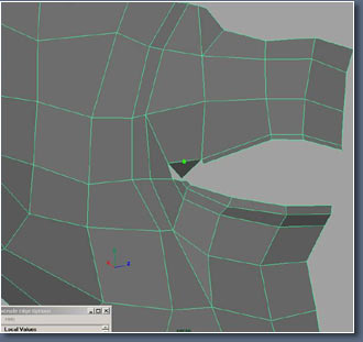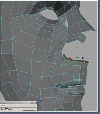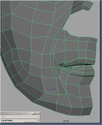 Marked in green extrude edges, marked in red merged edge's to form the corner of the mouth, if you don't want the triangles you can just delete that edge, but I'll just leave it for now.