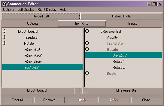 75, using the Connection Editor, connect the Heel_Pivot to the