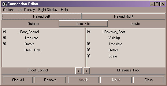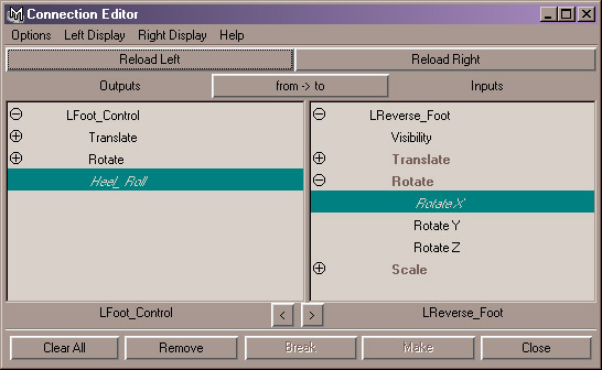 75, using the Connection Editor, connect the Heel_Pivot to the